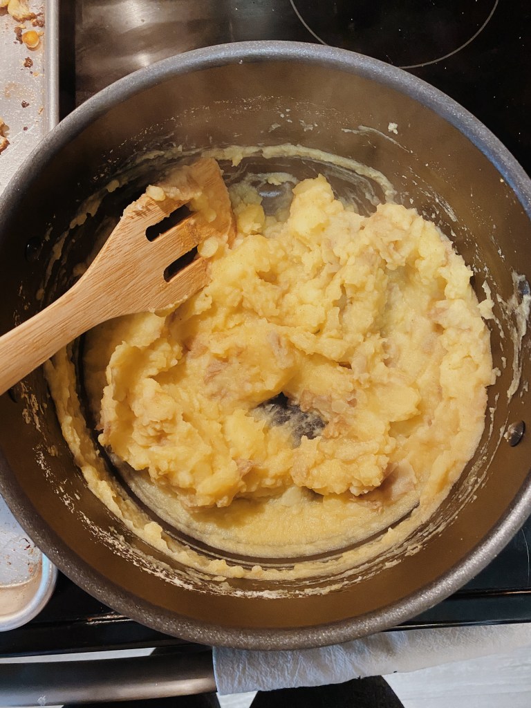 - Once the potatoes are fork tender, drain but keep about 1/2 cup of water. Mash the potatoes in the pot with the water, oil, and spices. After tasting mine I added bit more salt and a pad of butter – totally optional.