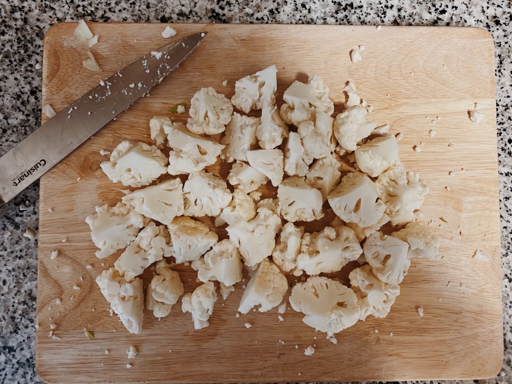 - Preheat oven to 425 F. Cut cauliflower head into florets, and rinse and drain chickpeas. Combine with oil and spices on baking sheet.