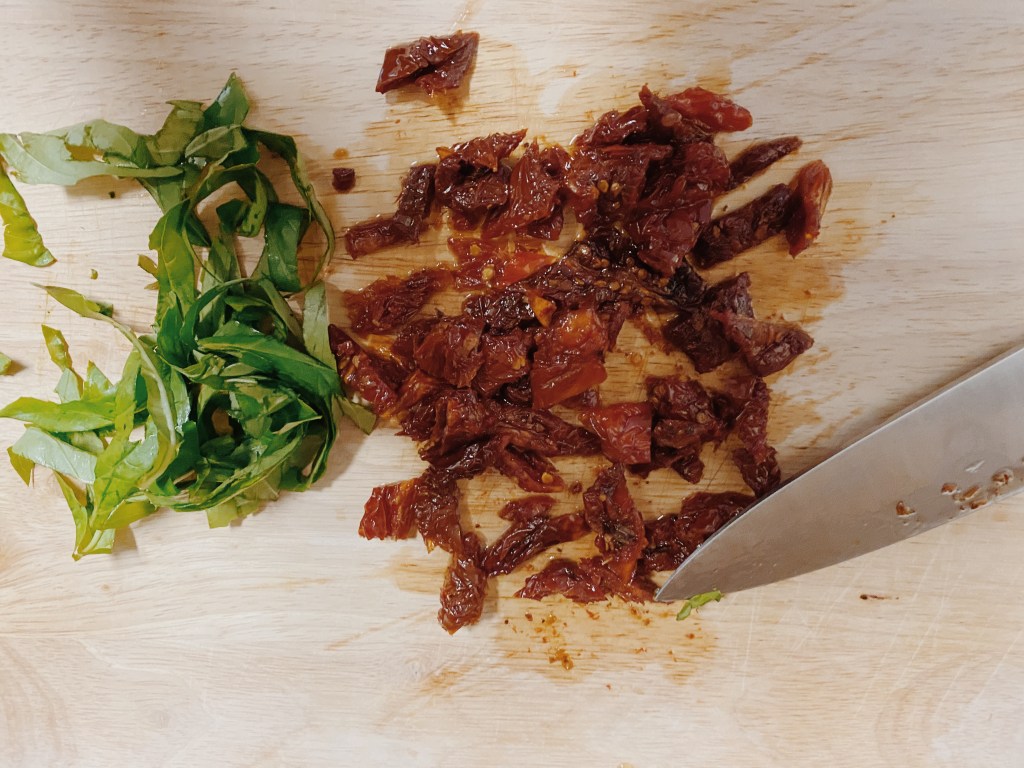 - Chop up the sun dried tomatoes and fresh basil.