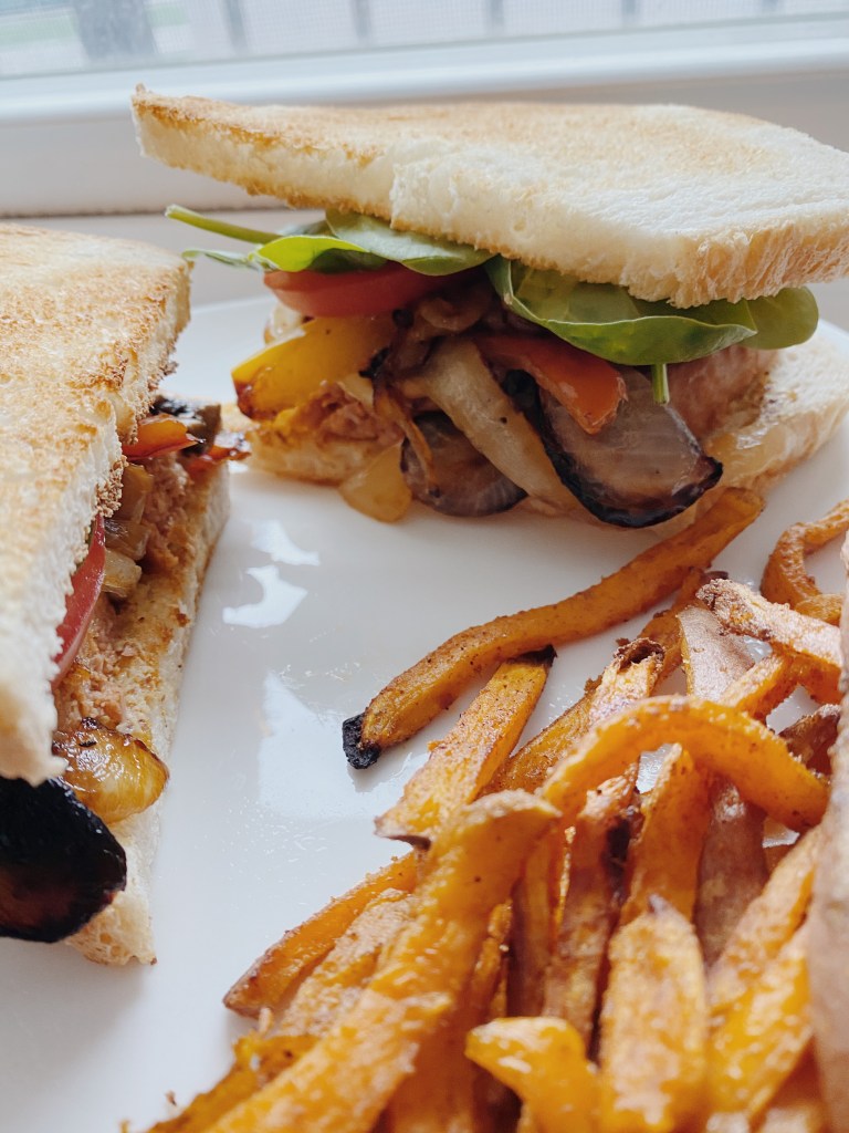 - I filled my sandwich with the classic peppers and onions accompaniment to sausages. I also added mushrooms cause yum, and tomatoes and spinach for freshness and because I had them. Make it your own! Add whatever veg tickles your fancy!