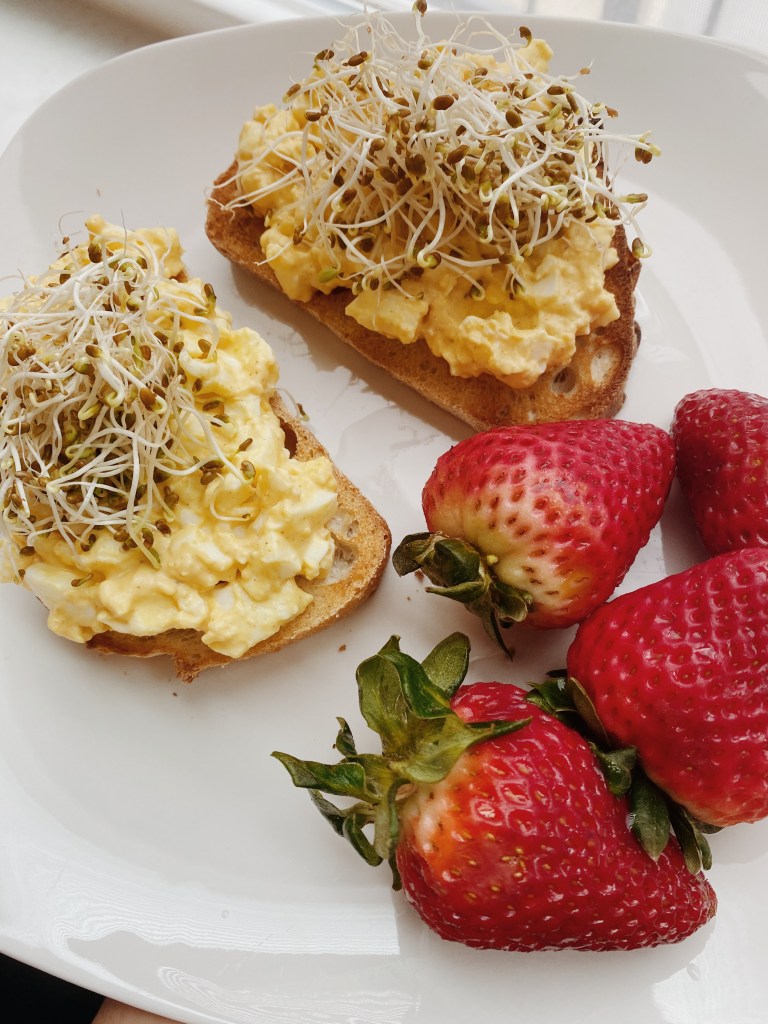 - Toast up your toast as toasty as the toast wants to toast. I like to spread a little more dijon on it before topping with a heaping scoop of the eggs. Top with sprout or whatever other greens you like.