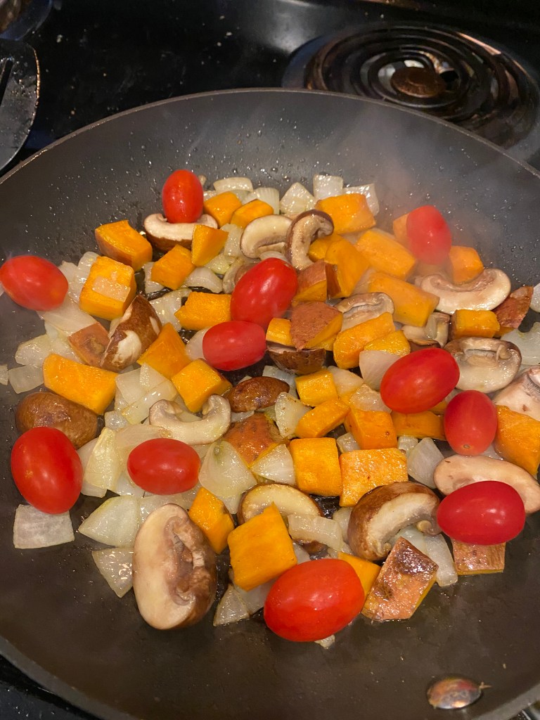 - Heat a large pan to medium heat with about a tablespoon of oil. Dice the sweet potato and the onion and add once the pan is hot. Let sit while you wash and slice the mushrooms.